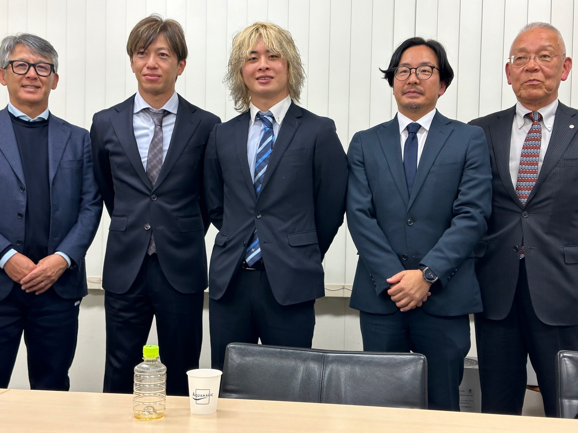 チームオーナー占部さんと、立川監督、大湯選手、広報村田さん、平岩さんが、