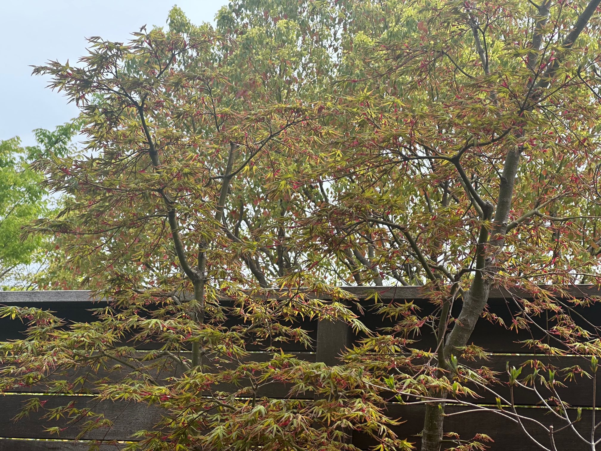 庭のモミジの木から若葉がいっぱい出て元気です。
