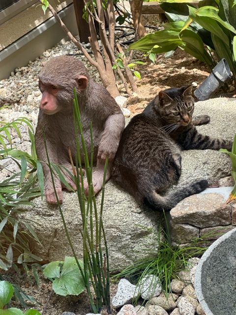 それどころか。中庭の植木の中に置いてある”猿の置物”にも、