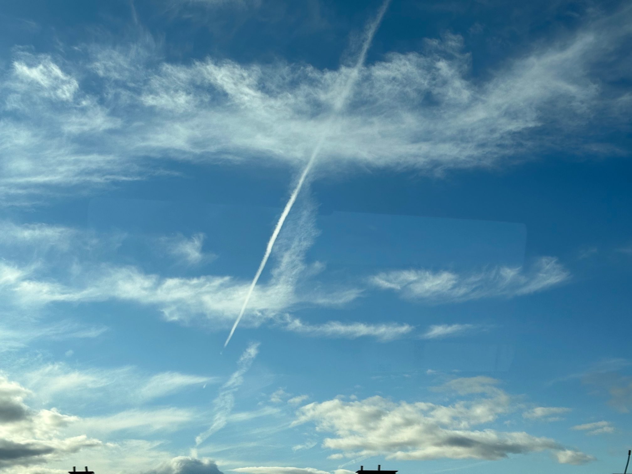 素晴らしい青空と白い雲でしたが、飛行機雲が出ていたので、