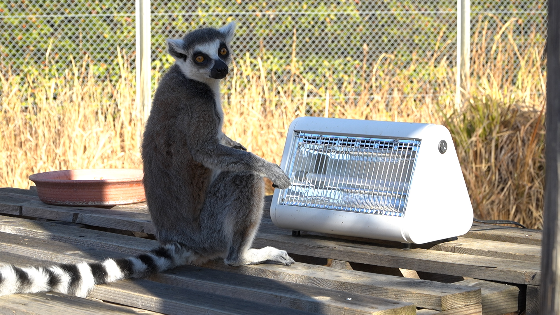 ヒーターで暖をとるワオキツネザル