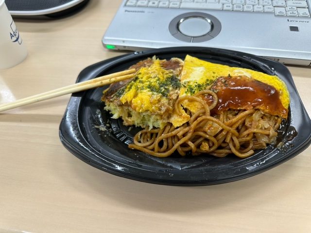 我が相方が、昼ご飯に買ってきたのが「お好み焼きとオムそば」のランチ。
